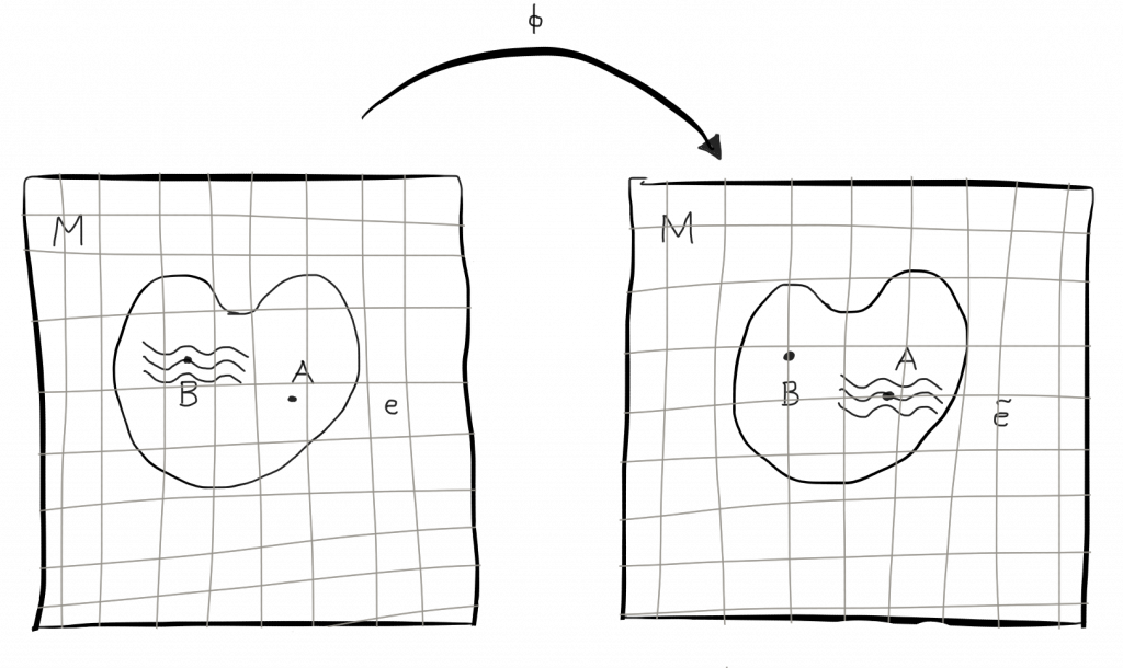 Now, since the Einstein equation is generally covariant, we can find a transformation ϕ that maps A to B and leaves everything outside the hole unchanged. The gravitational field gets now changed to ˜e=ϕ⋆e. Since A is mapped to B, the field ˜e is curved at A and flat at B.