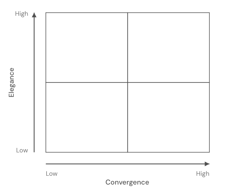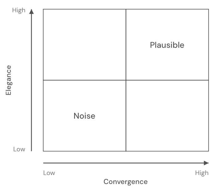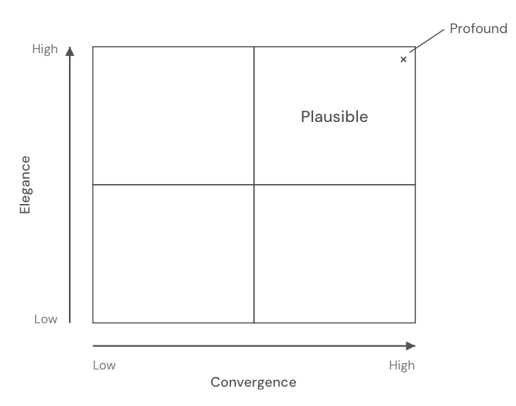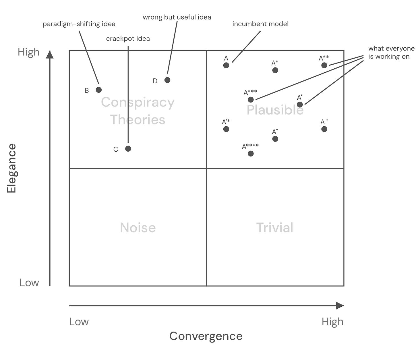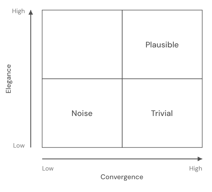 The elegance-convergence model provides a useful lens to understand this dynamic. As outlined at the beginning, our goal in science is of course to find plausible, or ideally profound, ideas.