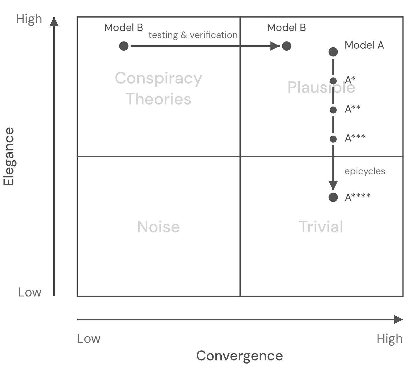New experimental evidence shows up that is not directly explained by Model A. But instead of pushing the model to the upper left quadrant, researchers quickly add small fixes. A little epicycle here, a new quantum field there. Instead of Model A we are now dealing with Model A*. In other words, researchers maintain convergence by sacrificing elegance. Researchers are usually unwilling to give up models they spent their whole careers mastering.5