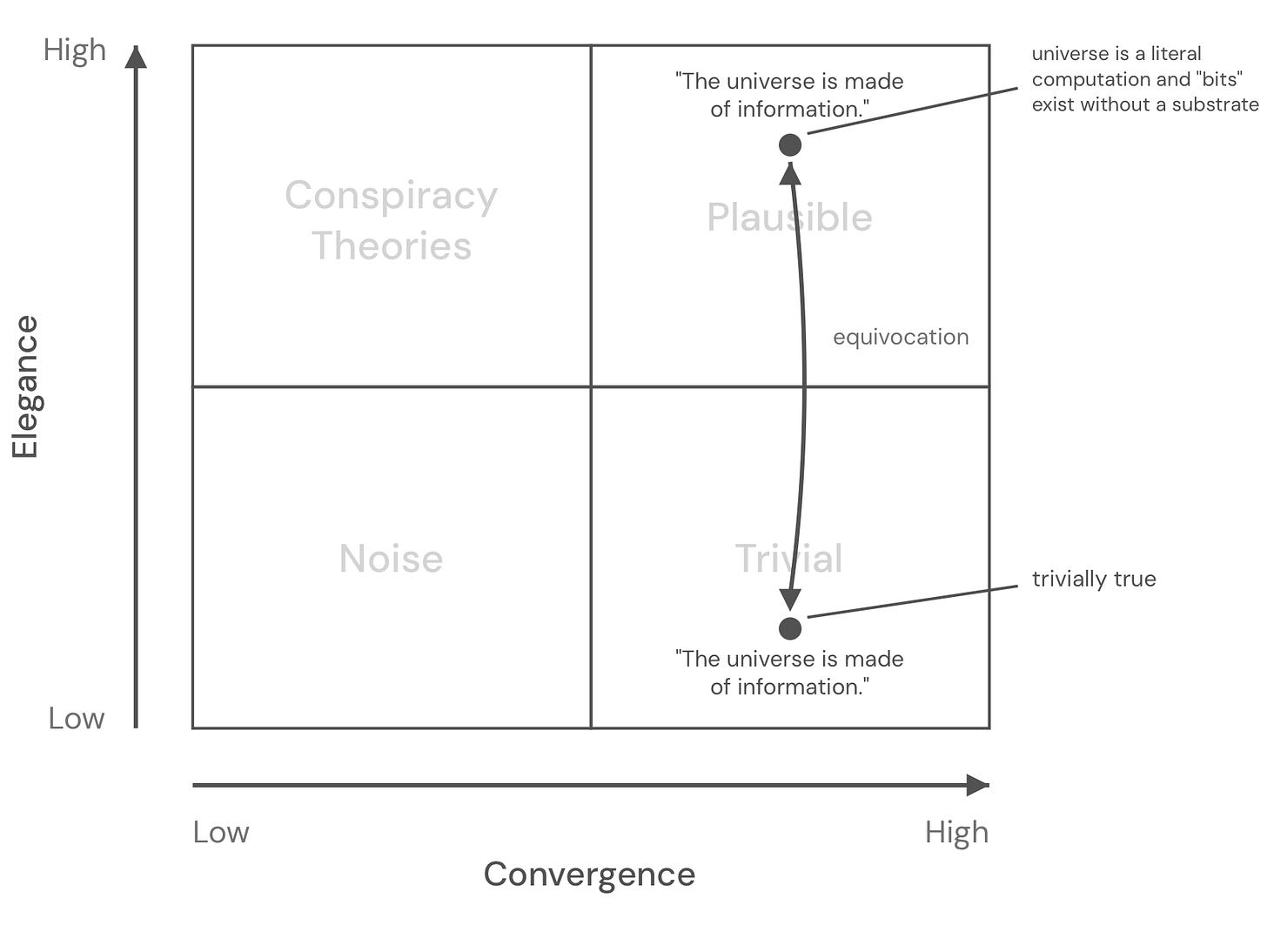 On the other hand, there is a good reason why the top-left quadrant is labeled “conspiracy theories”. They also belong here. Not every elegant idea deserves to be taken seriously.6