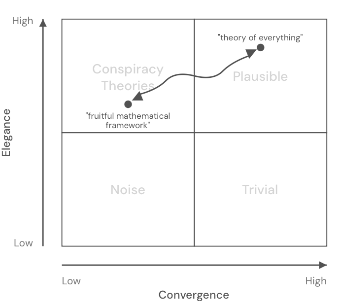 However, ideas that elevate our understanding of nature to a truly new level virtually always start in the top-left “conspiracy” corner. They are elegant but lack convergence. New ideas are mere hatchlings that stand no chance in a fight against the full-grown eagle that is the established best model. The incumbent model had many decades to accumulate evidence of convergence. No new model can provide anything close to that right from the start. And it’s not just a lack of experimental evidence but also formal convergence. Typically few of the structural arguments that squeeze it into place have been worked out right away.