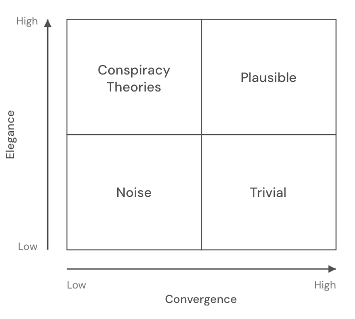 And lastly, highly elegant explanations with no convergence toward them are what we call conspiracy theories.